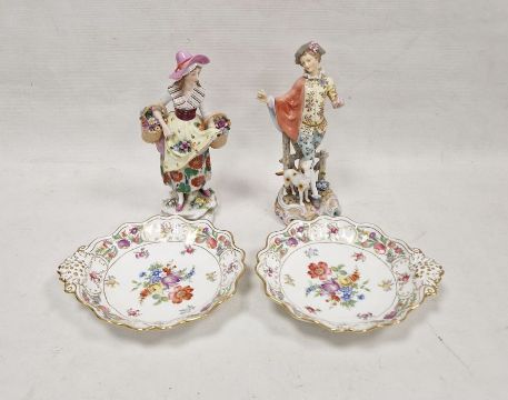 Two Continental porcelain figures, a German figure of a gallant with a hound (lacking left hand) and a lady carrying two baskets of flowers, two Hammersley Dresden Sprays bone china dishes printed with flower sprays, c, 1900 and later various marks  24.5cm high (4)
