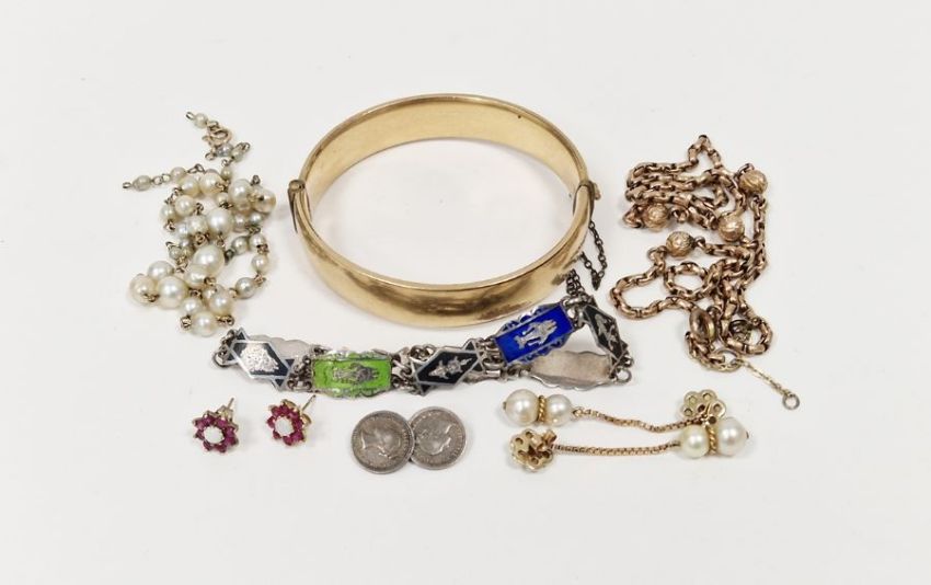 Pair of gold and opal flower-shaped oval cluster drop pearl earrings, 3.8g, a pair of gold, ruby and opal flower-shaped cluster stud earrings, a gold-coloured chain, a 9ct gold and metal claw bangle, etc