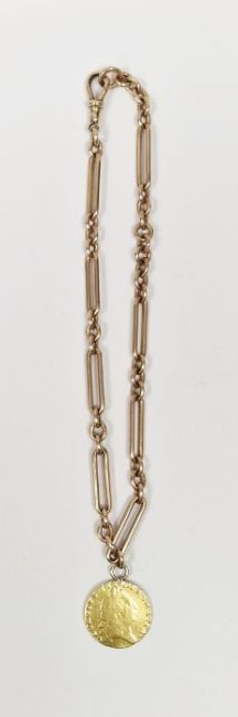 9ct gold chain with George III 1791 guinea, 42g in total approx.