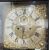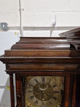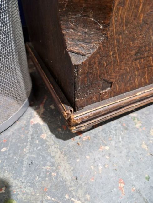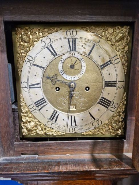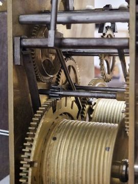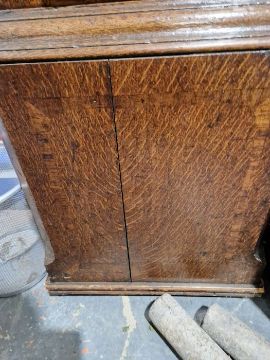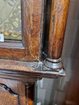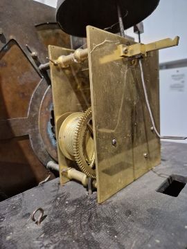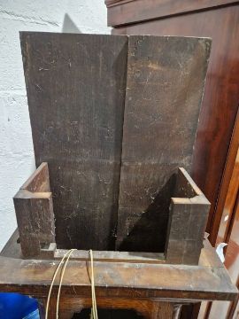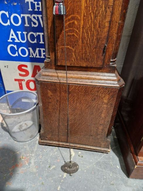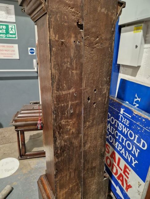 Case with numerous surface scratches, scuffs and knocks. Areas of loss to the veneer, fading and discolouration to areas. Split to the bottom of the case, split to the back. Dial with surface marks, tarnishing. General wear and tear. Has pendulum and weights. See photos.