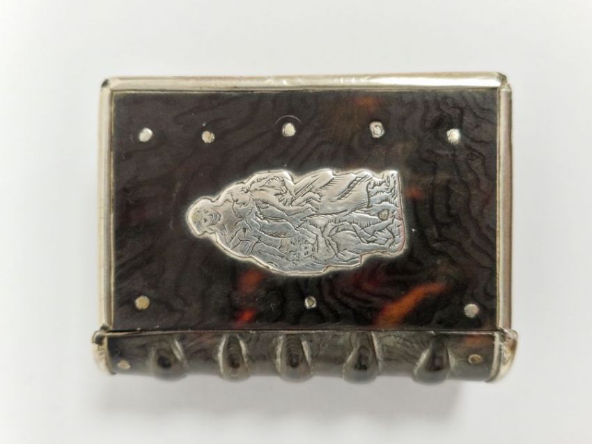 Surface scratches, accretions. Areas of metal mounts loose and coming away, also with areas of loss and dents, mainly to corners. Crack to one corner of the tortoise shell. Soldered repair to side. Tarnishing and oxidisation to the inside. General wear and tear. See photos.
