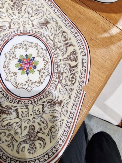 There is a chip to the sauce boat plate and a crack to one of the two-handled dishes. Overwise no major obvious damage apart general wear, etc. See attached images