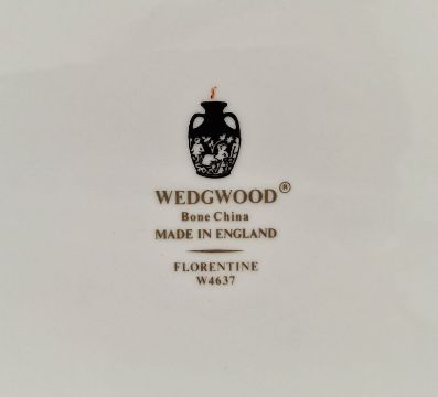 Wedgwood 'Florentine' pattern bone china part dinner service, printed and moulded with border of scrolls, vases and winged beasts, on an ivory-coloured ground, comprising two two-handled circular vegetable dishes and three covers, an oval serving dish, two sauce boats on stands, 12 dinner plates, 12 luncheon plates, 12 side plates and 12 pudding bowls (chip to one of sauce boat stands)
