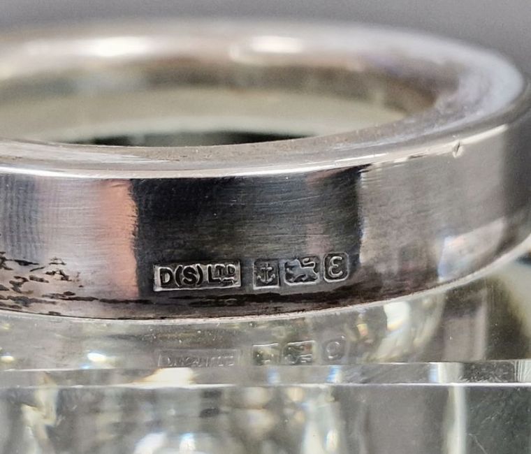 Silver-mounted cut glass inkwell, square with chamfered sides and corners, Birmingham 1979