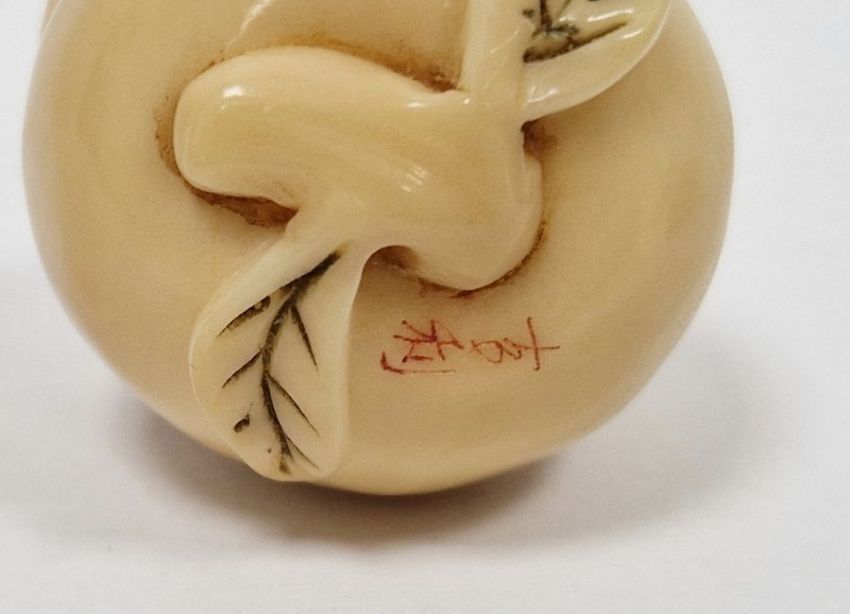 Japanese carved boxwood netsuke in the form of a rabbit, inscribed signature, 4.5cm long and three various resin/simulated ivory okimonos (4)