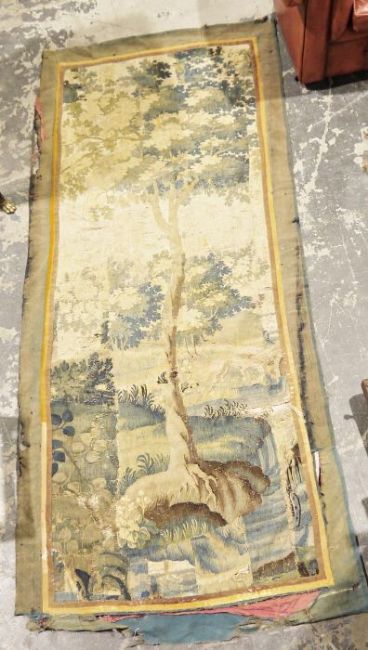 19th century wall hanging tapestry depicting a tree landscape, approximately 246cm x 108cm
