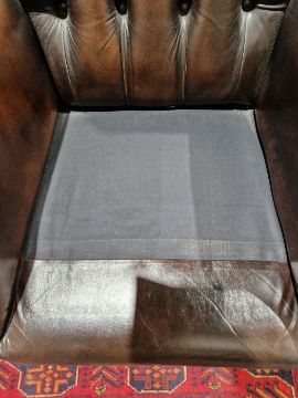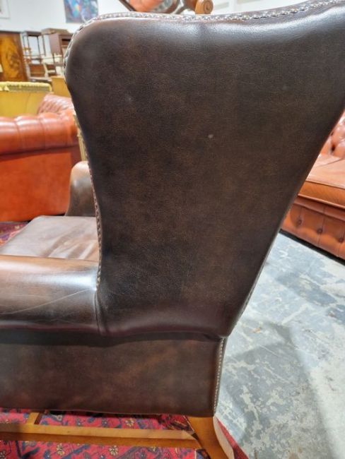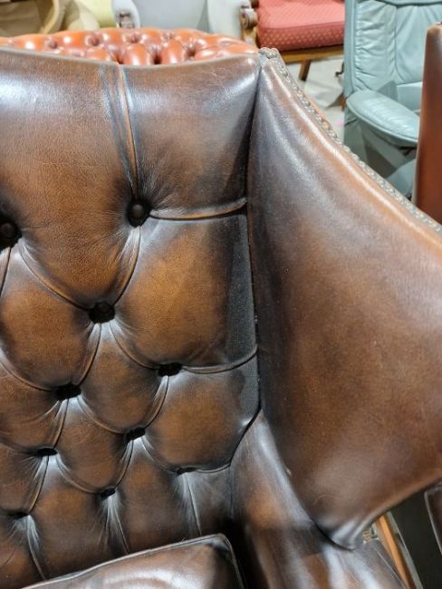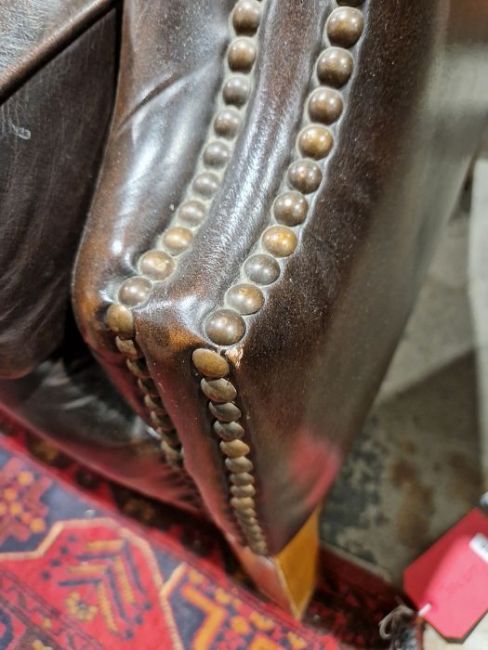 Surface scratches, scuffs, cracks to the leather, some fading. Stud missing from one chair. General wear and tear.