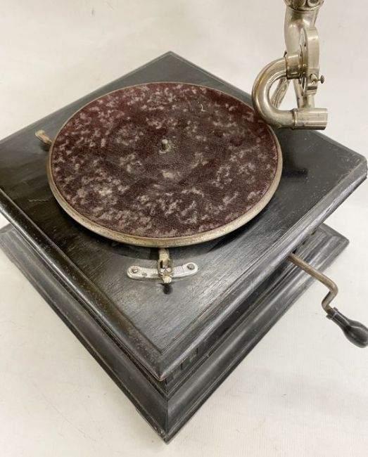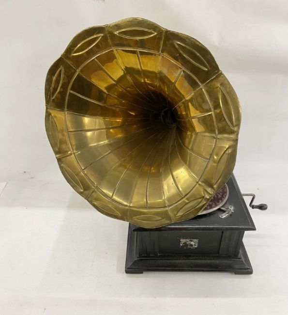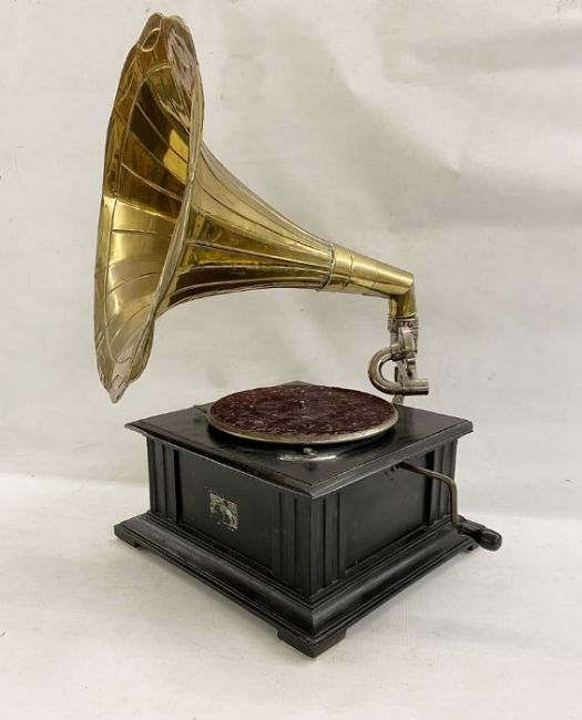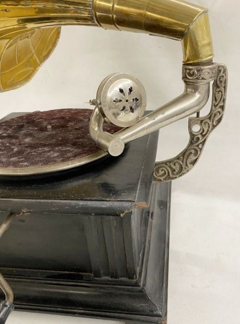 Antique HMV table-top gramophone, ebonised base with ornate scroll and pierced nickel arm, panelled brass horn with scalloped edge, the base 38cm square, the horn 46cm long overall approx. and a box of 78rpm records