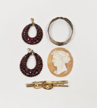 Gold bar brooch with scroll and ball decoration, a cameo with gold-coloured mount (damaged) and a pair garnet set loop pendant drop earrings (3)