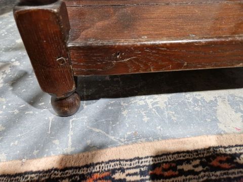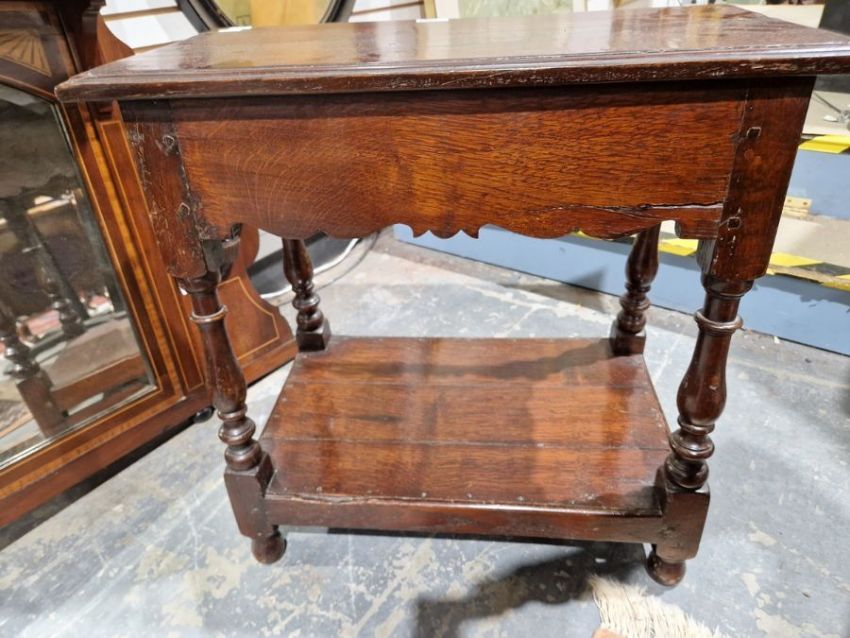 Antique oak side table with single drawer, brass handles, on turned supports and under-shelf. H. 58cm, W. 61cm, D. 30cm