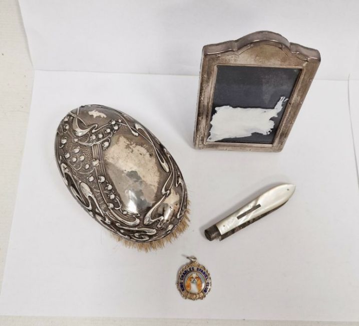Early 20th century silver mounted oval brush, lily of the valley decorated, a small modern silver mounted rectangular picture frame, a silver medallion 'King Charles Spaniel Club' and a silver and mother of pearl penknife (4)