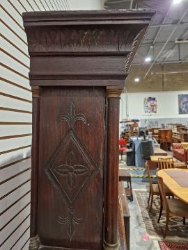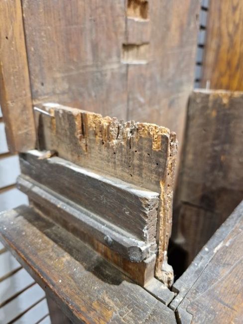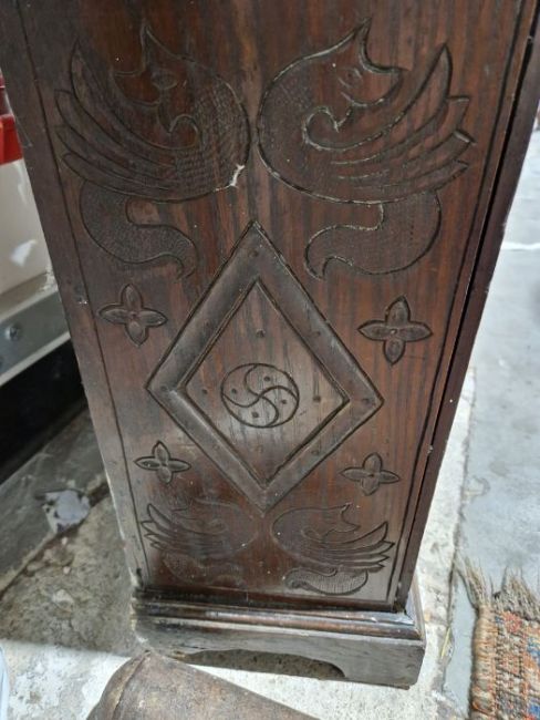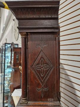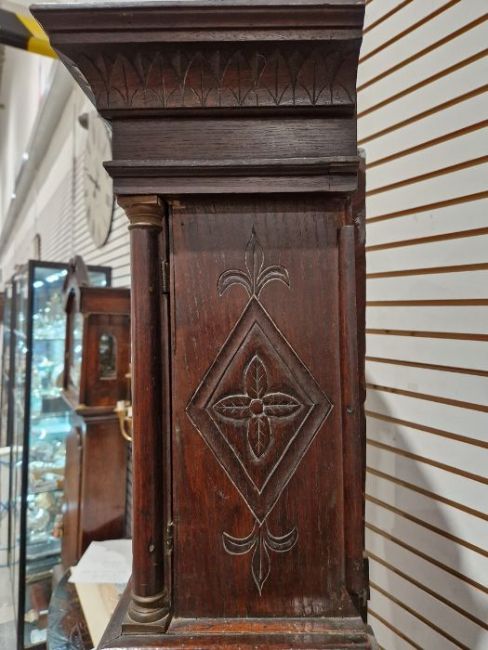 Surface scratches, scuffs and knocks to the case. Areas of loss to the wood. Evidence of old worm to case. Split to the base section. Cheeks with loss and old worm. Dial with surface scratches, accretions, tarnishing. General wear and tear. Pendulum, weights and winder are present.