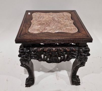 Chinese marble topped rosewood occasional table, shaped circular with beaded edge, pierced carving, four carved supports, X stretcher, 45cm diameter Condition ReportSurface scratches, scuffs and knocks to the wood. Areas of fading and discolouration. Area of loss to one leg and to top of one side friwze. Gaps between marble and wood. Marble has a crack and scratches.. General weaer and tear