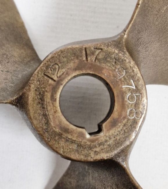 20th century bronze three-blade propeller with pressed numbers on side 12179758, 28cm approx.