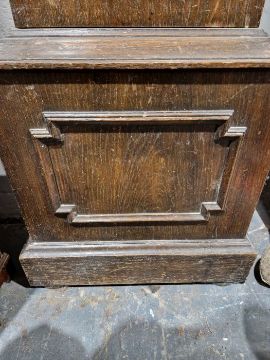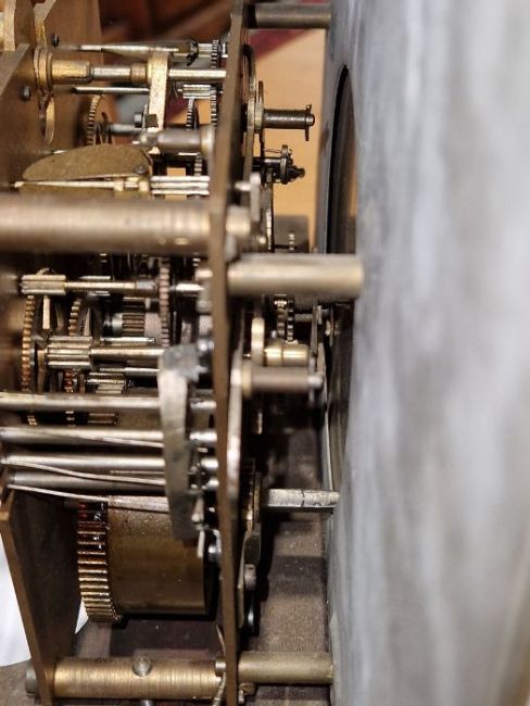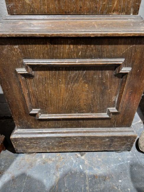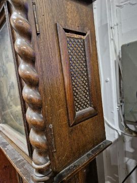 Surface scratches, scuffs and knocks to the case. Fading and discolouration. area of loss to beading on side of hood.  Dial with surface scratches, accretions, tarnishing. General wear and tear. Pendulum, weights and key present