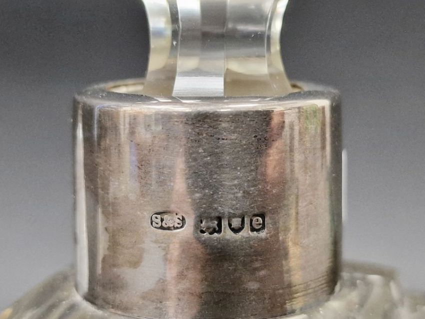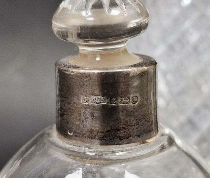 Silver-mounted cut glass scent bottle, ovoid, Chester assay, a smaller spherical scent bottle,  a conical, silver mounted scent bottle and a silver mounted spill vase (5)