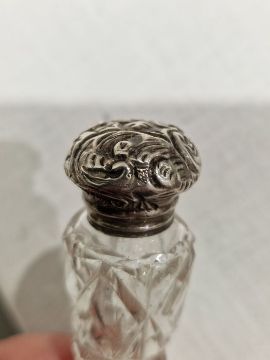 Silver-topped cut glass salts bottle with blue guilloche enamel top, another smaller with lilac enamel top, Victorian cranberry glass leaf-shaped scent bottle with silver top, double-ended blue glass scent bottle with silver top and with facet cut sides and four various silver-topped scent phials (8)  Condition ReportSilver on some has surface marks, small dents, tarnishing and accretions. Chip to the base on one. Chip to side of blue glass bottle.