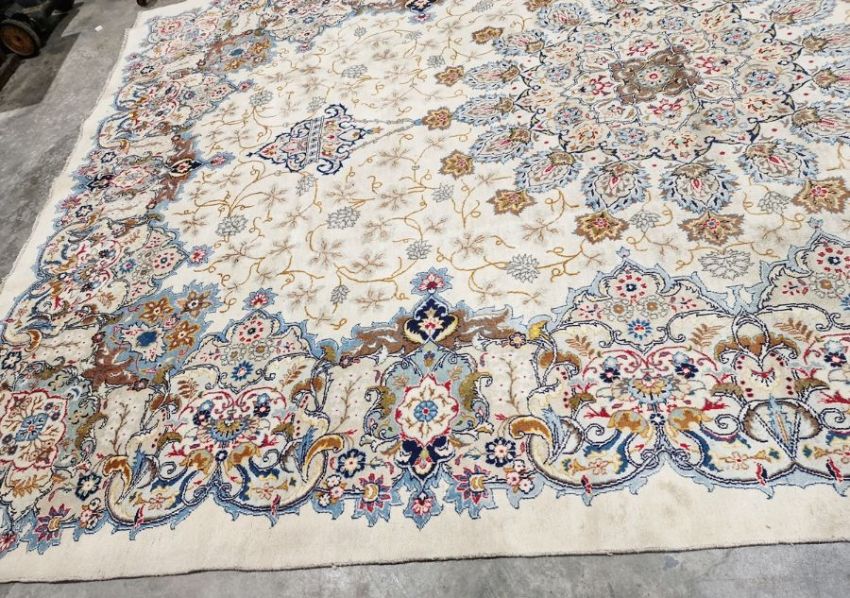 Central Persian Kashan cream ground carpet with large central floral medallion enclosed by hanging baskets and floral pattern to a floral border, 480cm x 300cm
