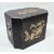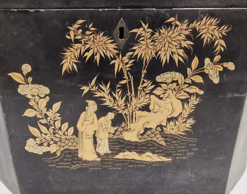 Oriental black lacquered regency-style chinoiserie box with canted corners decorated in gold with garden scenes of figures, bamboo, pagoda and other floral motifs, 37cm x 27cm x 29cm