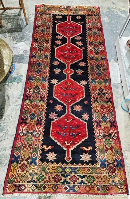 North east Persian midnight blue ground Kurdie runner with four joined hexagonal medallions enclosing stylized birds, the field with floral and stylised bird shapes, multiple geometric borders (265 x 105 cm)