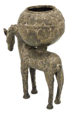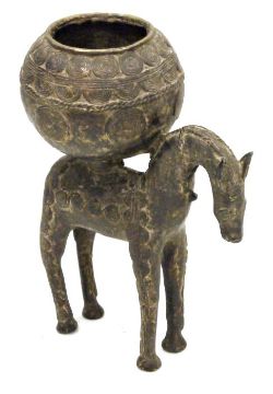 Possibly North African cast metal model of a horse bearing a spherical pot, allover whorl embossed, 23cm high