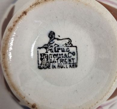 Group of late 19th/early 20th century Continental pottery, including four Petrus Regout & Co (Maastricht) sponged and painted pottery tea bowls, a Makkum fluted hexagonal basket painted with flowers, with white metal swing handle and various items of Sarreguemines pottery wares including two plaques, coffee pot cover and a saucer and a Dutch commemorative tile dated 1937-1962, various printed, painted and impressed marks
