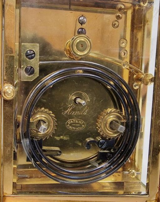 19th century gilt repeating carriage clock by S J Rety, reeded bar handle, reeded columns, flanking the engraved brass face, stepped base, 20cm high