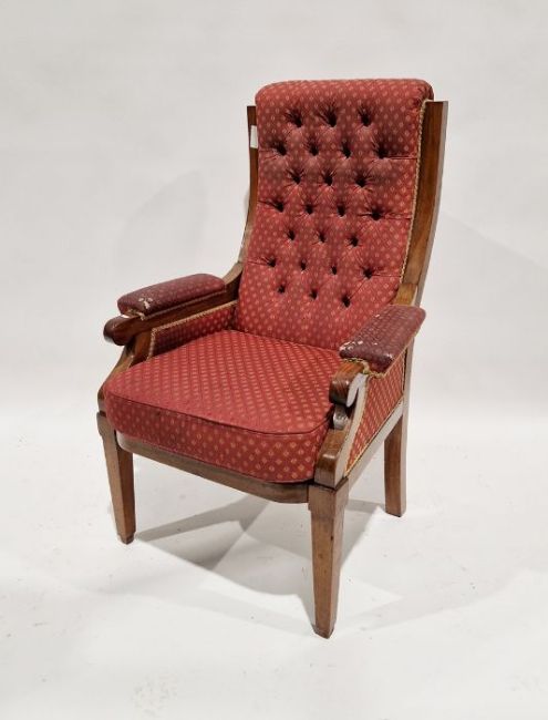 Victorian mahogany button back arm chair, with red and gold upholstery and scrolling arms, front squared tapering legs, approximately 119cm high