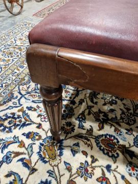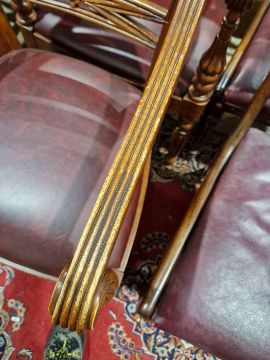 Set of ten early Victorian mahogany dining chairs, each with scroll top rail, relief mould cross rail, Trafalgar seat, moulded seat rail, on reeded tapering supports and a similar pair of mahogany open carvers (12) Condition ReportSurface scratches, scuffs and knocks to the wood, some fading and discolouration. Three chairs missing applied scroll from back rest. One chair with split and repair to front leg. One chair with broken back rest. One chair with repair to back leg.Scratches and scuffs to leather seats. General wear and tear.