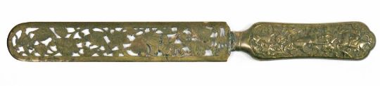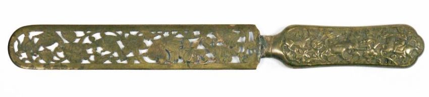 Early 20th century Anglo-Indian metal page turner/letter opener, the handle embossed with birds and a tiger amongst a hunt, the blade with pierced and etched decoration depicting birds and foliate motifs, 28cm long approx.