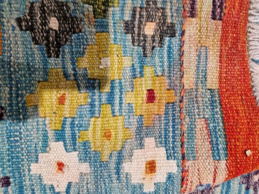 Chobi orange ground kilim with lozenge trelliswork and floral border, 155cm x 107cm