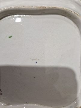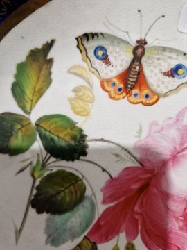An English porcelain part dessert service, circa 1820, probably Ridgway, pattern no.375, each piece with royal blue and gilt fruiting vine border, naturalistically painted with tulips, sunflowers, roses, insects, butterflies and other flowers, comprising two large square serving dishes, two smaller shaped square serving dishes, two shaped oval serving dishes, two covered tureens and eight plates Condition ReportLight surface scratches, minor wear to gilt and areas of the decoration. One tureen with small chip to rim. Both serving plates with crazing. General wear and tear. Plates - Diam. 21.5cmSquare serving dish - Diam 22cmSquare serving dish - Diam 22.5 x 21cmOval serving dish - 28cm x 22cmTureen height 16cm