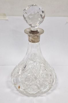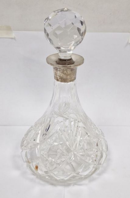 Cut glass ship's decanter of traditional form with silver collar and facet cut ball stopper, 27cm high overall