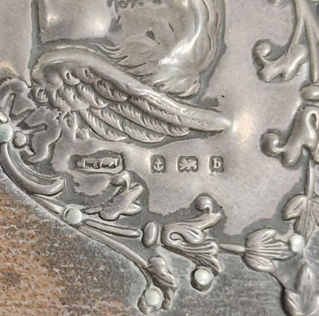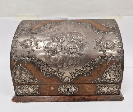 Early 20th century silver-mounted leather stationery box, repousse decorated with cherubs, Birmingham 1901, maker Matthew John Jessop, 20cm high x 31cm wide