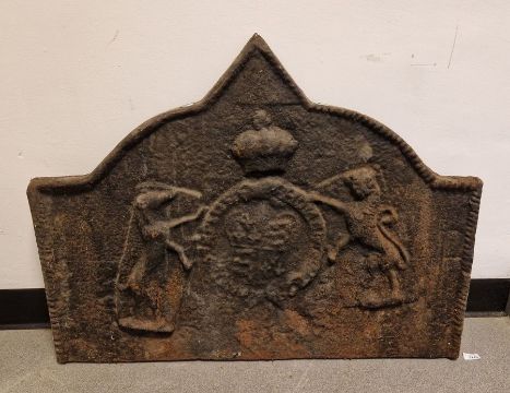 Cast iron fireback with indistinct armorial crest, possibly a royal coat of arms, broken arch top with triangular pinnacle, 69cm x 89cm