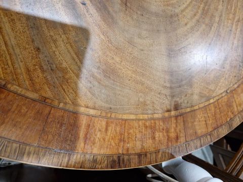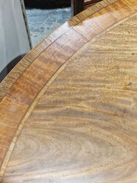 George III mahogany dining table of oval form, the top having broad crossbanding, boxwood and ebony stringing, raised on splayed quatrefoil legs with brass caps and castors, 73cm high x 160cm wide x 120cm deep