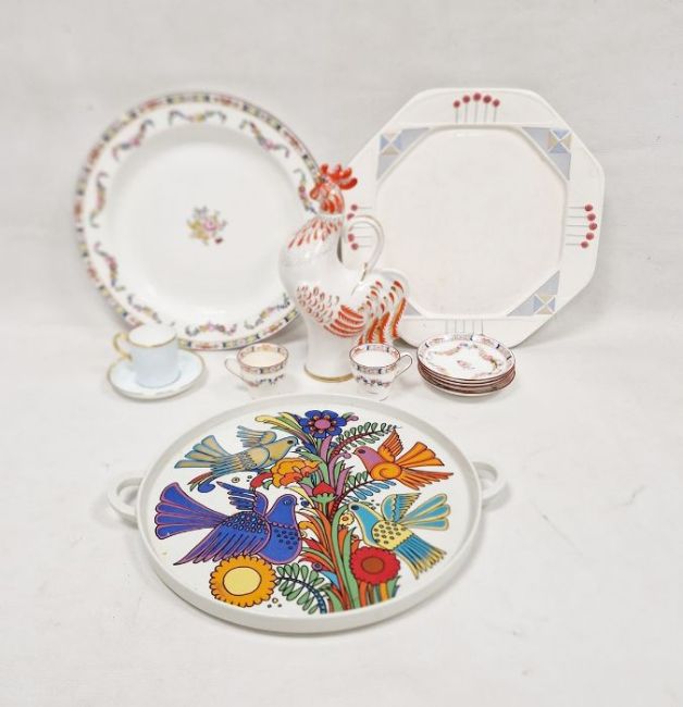 Russian (Lomonsov) porcelain vodka decanter modelled as a cockerel with head-shaped stopper, enriched in orange and gilding, printed 'Made in USSR' mark, with cork stopper, 25.5cm high a Continental pottery Seccessionist-style octagonal plate, a Villeroy & Boch 'Acapulco' pattern two-handled circular tray printed with stylised bird, a Minton bone china and gilt coffee can and saucer, printed crown ER1962 marks, a Mintons flower-pattern large circular dish and three coffee cups and four saucers