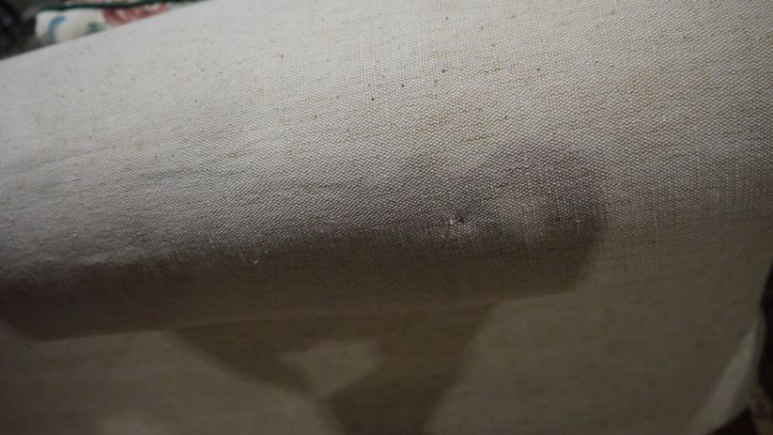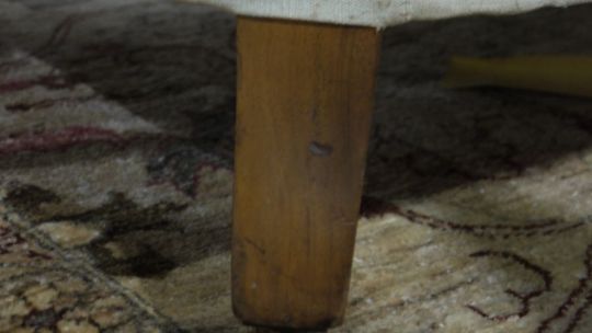 Stains throughout upholstery, some rips and holes, upholstery has come loose around the back. Some small chips and wear to feet and castors. General wear as expected with age. Please see additional photos.