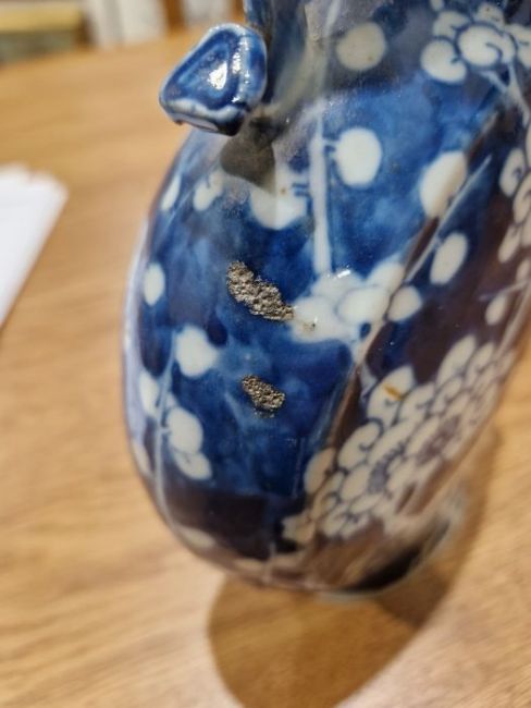 Surface marks and accretions. Imperfections and inclusions to the glaze. Small chips to the rim on one. Drilled hole towards the base on both. General wear and tear.