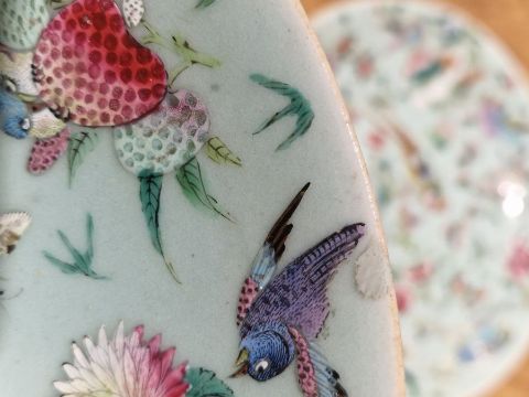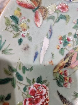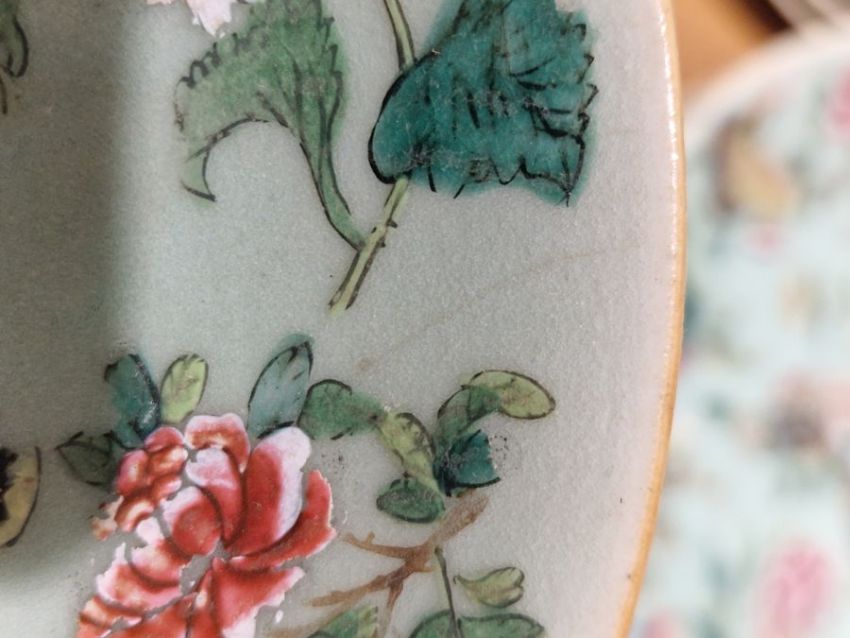 Light surface marks, all with varying degrees of loss to the enamel decoration, crazing to some, some with chips and and some with hairlines. General wear and tear.