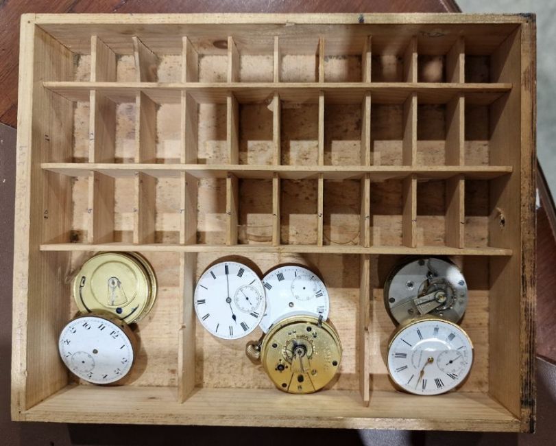 20th century stained wooden storage cabinet containing a quantity of assorted pocket watch movements, parts, dial covers, wristwatch straps and related items, 38cm high