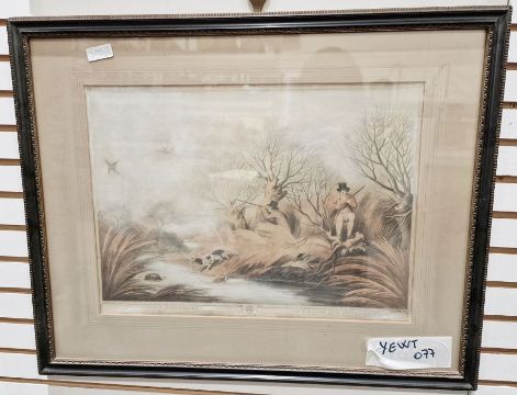 Three prints, "Rabbit Shooting", "Duck Shooting" and "Woodcock Shooting", all framed and glazed, 32.5 x 45.5cm, together with a watercolour of two deck chairs on a beach (4)