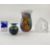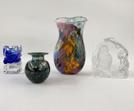 Andrew Sanders and David Wallace British contemporary blue and clear glass candle holder, 10.5cm high, a Mats Jonasson clear glass paperweight of an owl, a lustre vase, signed Bath 2009, and an art glass vase in pink, orange and blue (4)