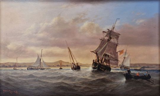 Pair of marine paintings depicting coastal scenes with schooners and rowing boats, both signed lower left, 17.5cm x 28cm, both bear Davis Cross Gallery labels verso (2)