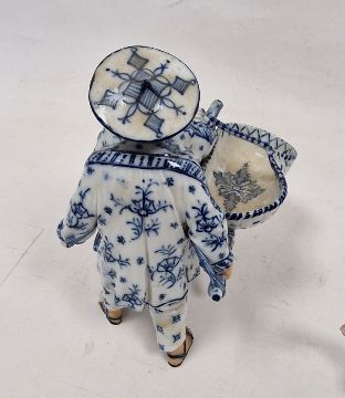 Pair of German small porcelain figures with cattle, modelled carrying baskets of grapes and flowers, a Continental porcelain group of two Chinese figures pushing a wheelbarrow sweetmeat dish, enriched in blue and white, 18cm wide and a Royal Worcester model of calves modelled by Doris Lindner, on a rectangular grassy green base, printed and painted marks (4)