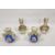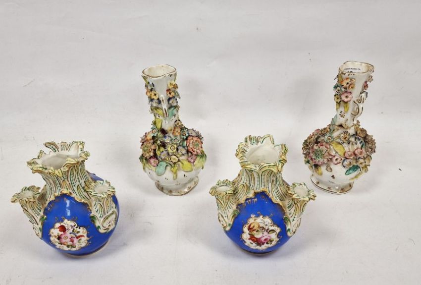 Pair 19th century porcelain bottle vases, all-over floral encrusted, 22.5cm high and a pair of blue-ground flower/spill vases with floral reserves, 17cm high (4)