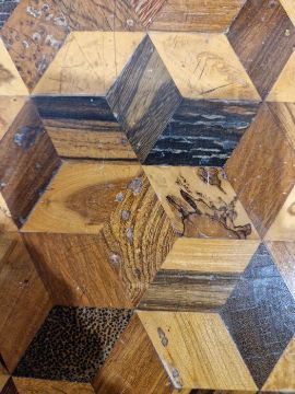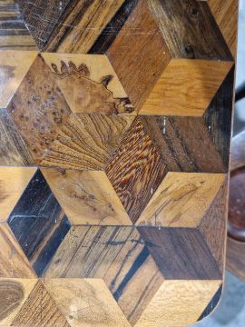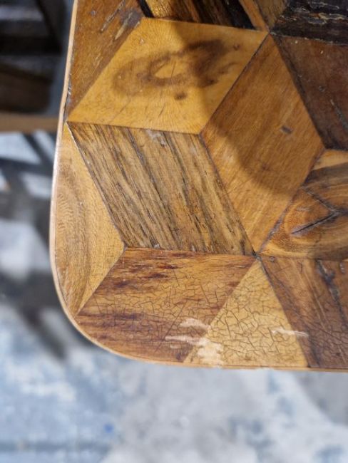 Surface scratches, scuffs and knockes to the wood. Some splits and areas of loss to the veneer. Probabably once had a tray under the slide off top which is not there. Some fading and discolouration. General wear and tear, see photos.