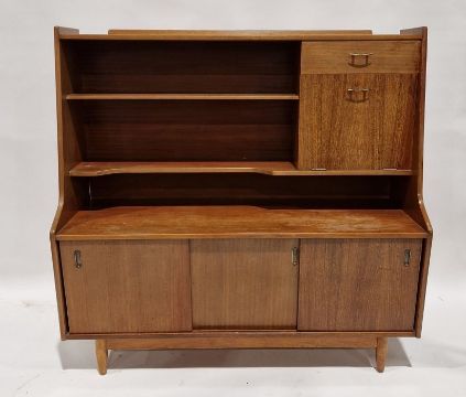 Mid-century White & Newton teak sideboard/cocktail cabinet comprising of a single drawer and drop front section adjacent to two shelves above triple sliding door cupboard, raised on cylindrical supports, H. 123cm x W. 125cm x D. 42cm