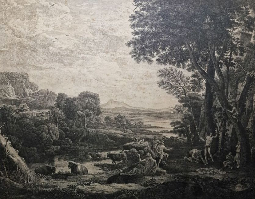 Pastoral landscape with classical figures, engraved by J. S. Muller, framed and glazed, 47cm x 59.5cm (2)