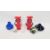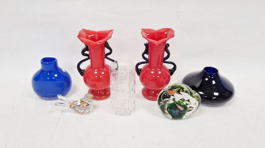Frank Thrower for Dartington 'nipple' vase, 15cm high, a blue glass vase signed indistinctly to base, 13.5cm high, a glass bird and a blue glass vase, 10cm high, a glass paperweight decorated with fish and a pair of Bohemian red glass 'Tango' vases with blue handles, 21.5cm high (7)